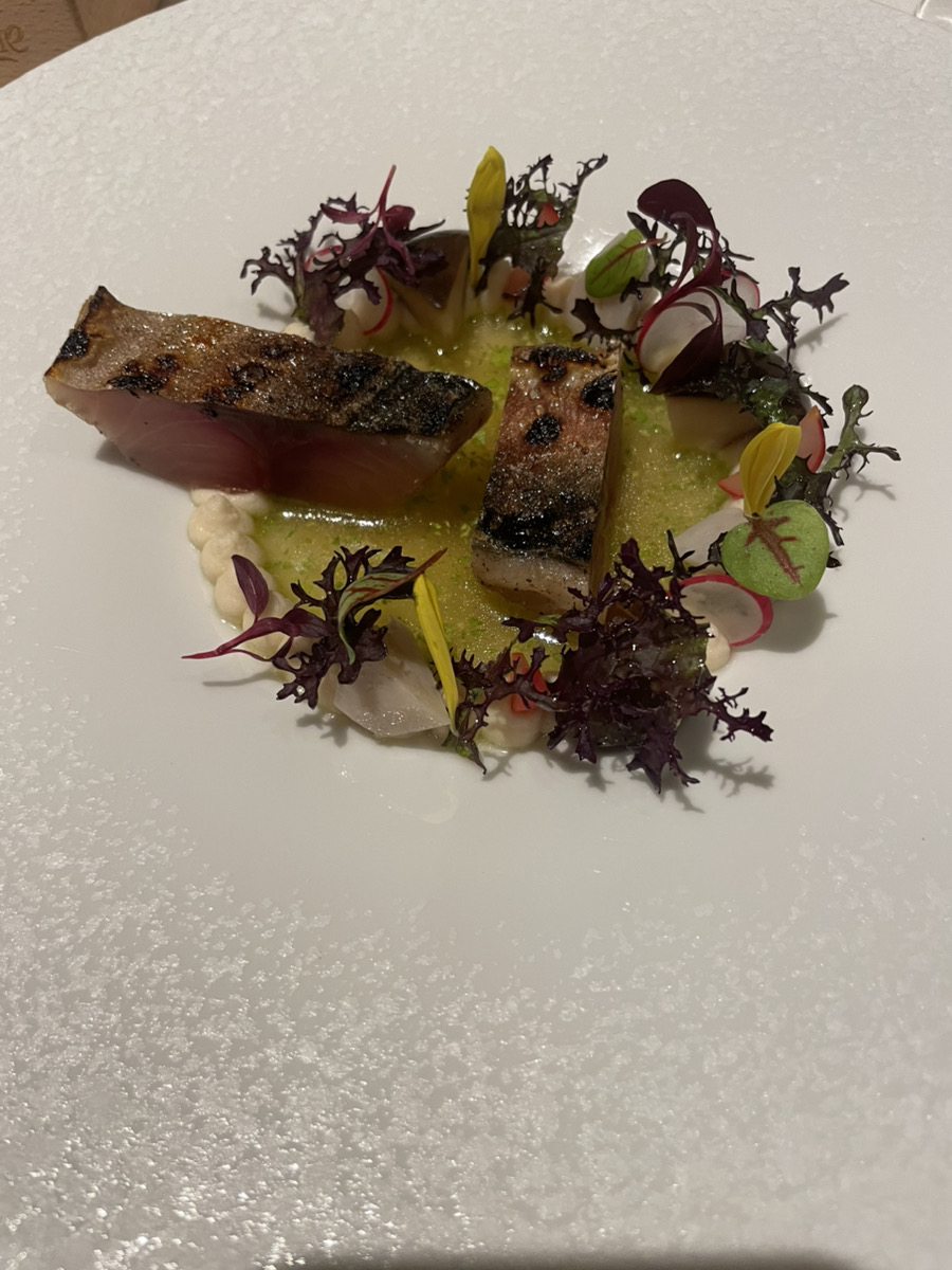 Marinated Saba with Fleur de Sel, Celery Leaf Stock, Celeriac Cream, and Citrus Vinaigrette