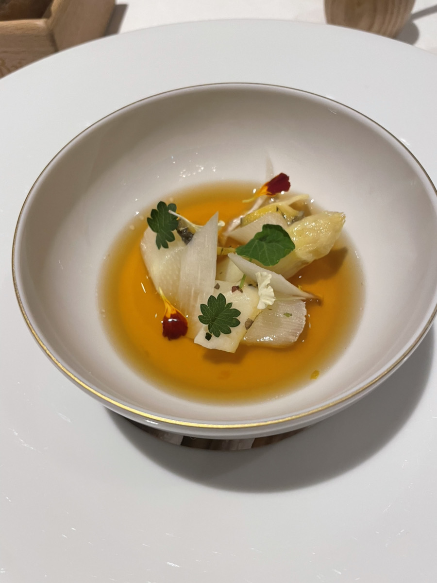 ホワイトアスパラのバターコンフィ ヴァンジョーヌ風味のコンソメ 柚子