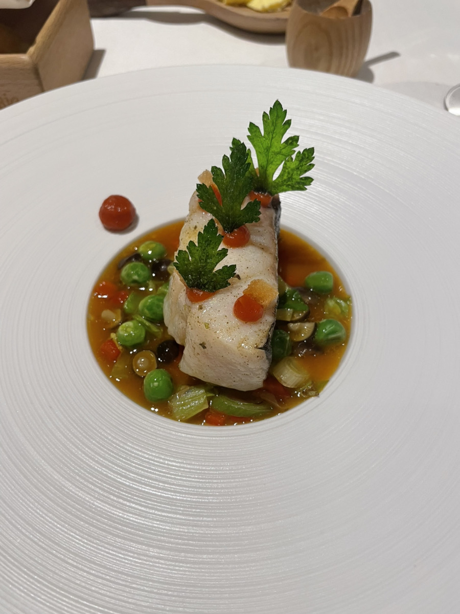 鱈のポワレ海藻バター風味 グリーンピースのブレゼ 赤パプリカペースト サフランの香り